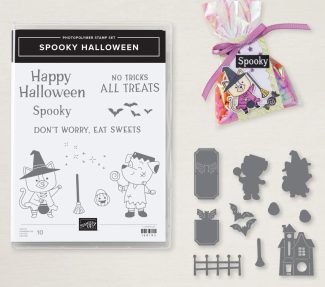 Halloween isn’t SPOOKY when you have a cute cat and dog dressed up in costumes from the SPOOKY HALLOWEEN BUNDLE! Stamp, color and cut them out with coordinating SPOOKY HALLOWEEN DIES, then add a broomstick, candy bucket, haunted house or bats to finish decorating your Halloween cards and craft projects! The darling SPOOKY SWEET 12×12 DESIGNER PAPER is a perfect addition. In our SPOOKY HALLOWEEN COLLECTION, you’ll get step-by-step tutorials for SIX projects…four cards and two fun Iridescent Treat Bag favor ideas for your “ghoulish” friends!