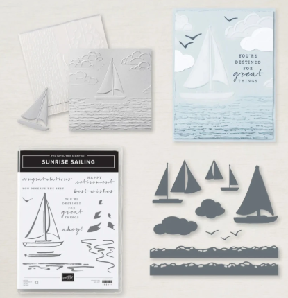 Create beautiful sailboat scenes with a moving ocean and textured sky using Stampin’ Up!’s SUNRISE SAILING STAMP SET, DIES, AND HYBRID EMBOSSING FOLDER! You can fill your hand-made projects with waves, clouds, seagulls and different sized sailboats. We are also showcasing FOUR card techniques to use with the SUNRISE SAILING BUNDLE…we know you’ll have a blast making them! Our SUNRISE SAILING COLLECTION has EIGHT new card projects. We’ve paired the SUNRISE SAILING BUNDLE with the THOUGHTFUL JOURNEY 6×6 DESIGNER PAPER for a variety of gorgeous sky and water looks. You’ll get step-by-step tutorials for EIGHT cards…four using special techniques…that will be so fun to teach in your classes or make on your own!