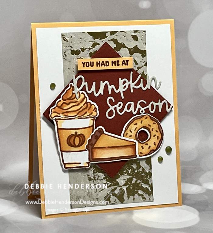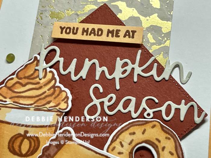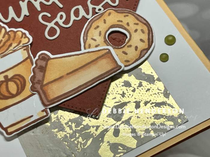Using the stamps and dies, I added pumpkin coffee, pumpkin pie and pumpkin donuts. I colored all three images with Stampin’ Blends once I stamped with Copper Clay Ink. Below are a few photos of the details: