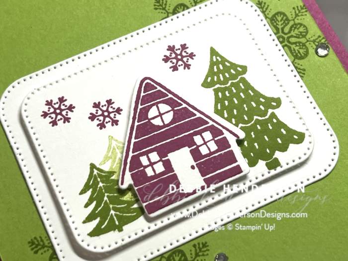 • House: Stamp the house image on Basic White Cardstock with Berry Burst Ink. Cut with the die. Glue over the trees with Stampin’ Dimensionals.