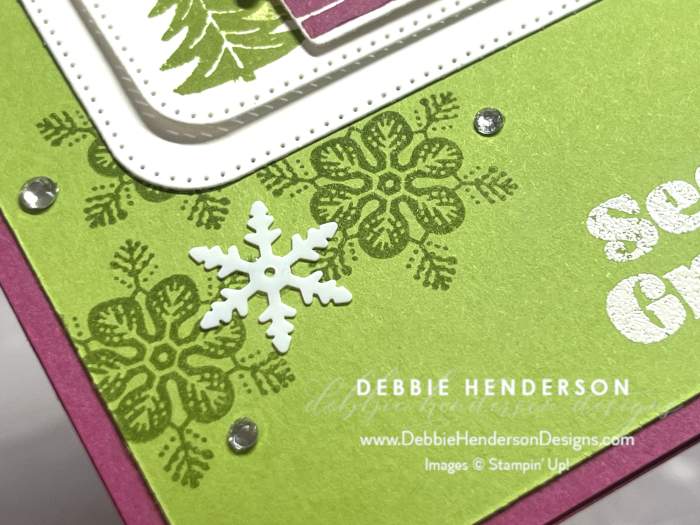 • Layer 2: Granny Apple Green Cardstock 5-1/4 x 4. Stamp the snowflake image with Granny Apple Green Ink starting at the top right and stamping diagonally to the bottom left. Stamp the sentiment at the bottom right corner with VersaMark Ink. Sprinkle with white embossing powder. Melt the powder with a Heat Tool. Glue layer to card base.