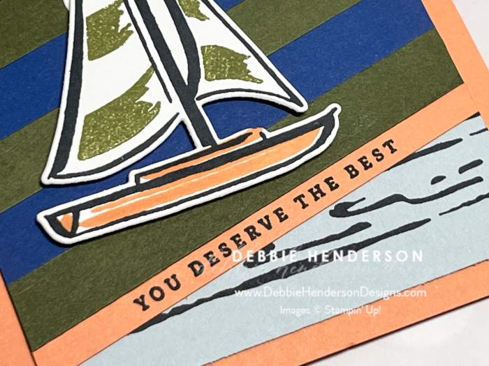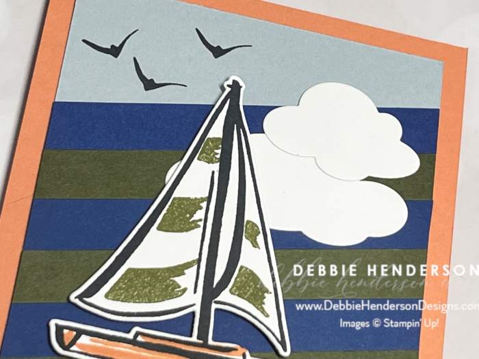 - Sailboat: Stamp the sailboat image on Basic White Cardstock with Secret Sea Ink. Stamp the inside of the sails with Old Olive Ink. Stamp the bottom of the boat with Timid Tiger Ink. Cut with the die. Glue to card front with Stampin’ Dimensionals.