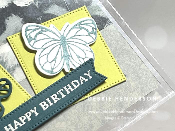- Banner: Stamp the sentiment on Pretty Peacock Cardstock with VersaMark Ink. Sprinkle white embossing powder and melt with the Heat Tool. Cut with the banner die from Stylish Shapes Dies. Glue below the butterflies with Stampin’ Dimensionals.