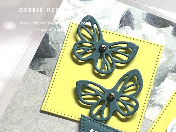 - Diecut Butterflies: Cut (2) small butterflies with the die and Pretty Peacock Cardstock. Glue to the square on the left with Mini Stampin’ Dimensionals.