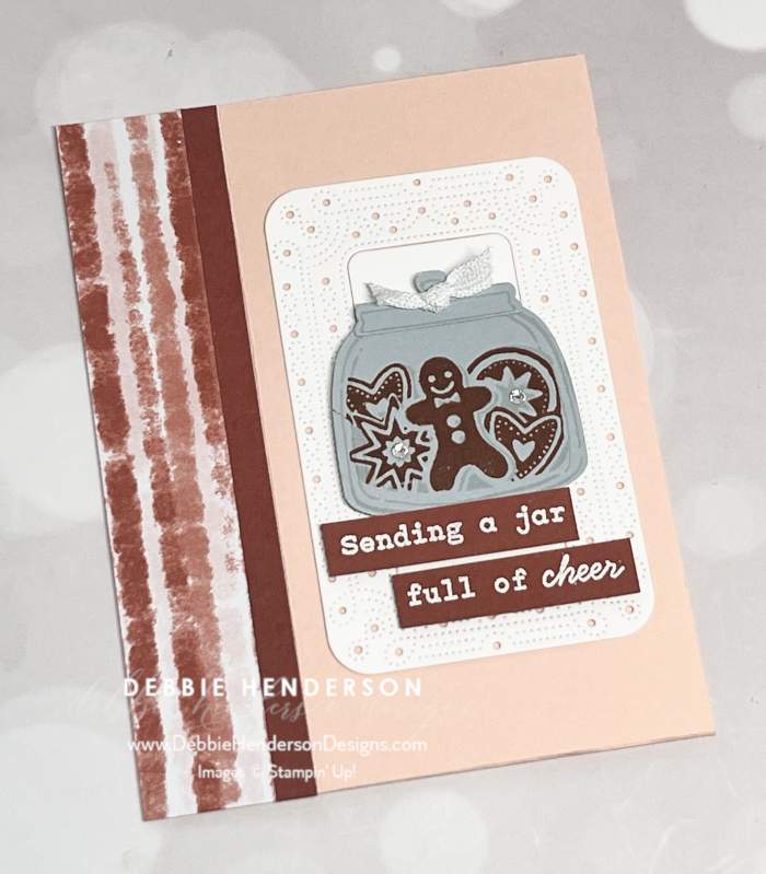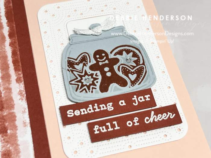 • Sentiment: Stamp the sentiment with VersaMark Ink on Cajun Craze Cardstock 1/2″ wide. Cut into two lines of text and cut close to the ends. Glue below the jar with Stampin’ Dimensionals.