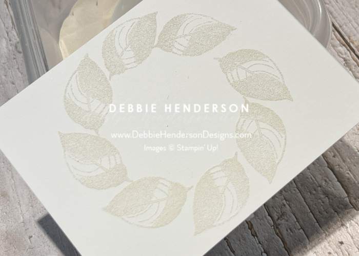Once my leaves were heat-embossed, I used a Blending Brush to add Lemon Lime Twist Ink over the embossing. The embossing resists the ink so the white peeks through. I used a little trick to get my wreath nice & round and I’ll show you how below: