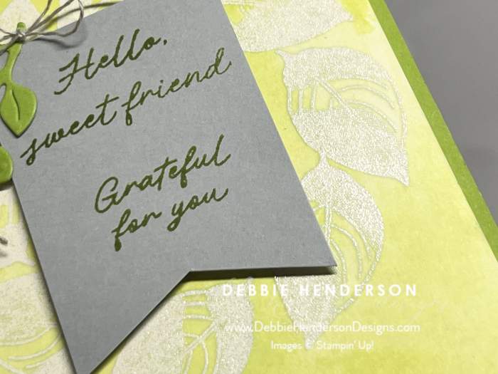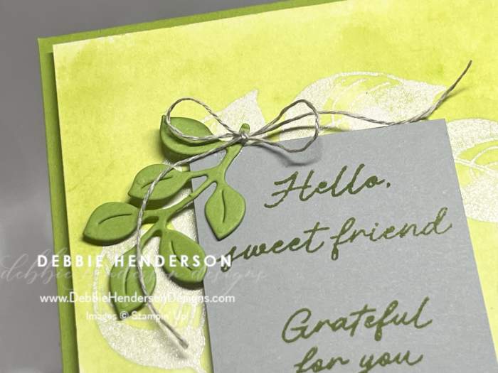 - Banner: Smoky Slate Cardstock 2-3/4 x 2. Trim the bottom into a banner shape with Paper Snips. Stamp the 2 sentiments with Granny Apple Green Ink. Glue to the center of the card with Stampin’ Dimensionals.