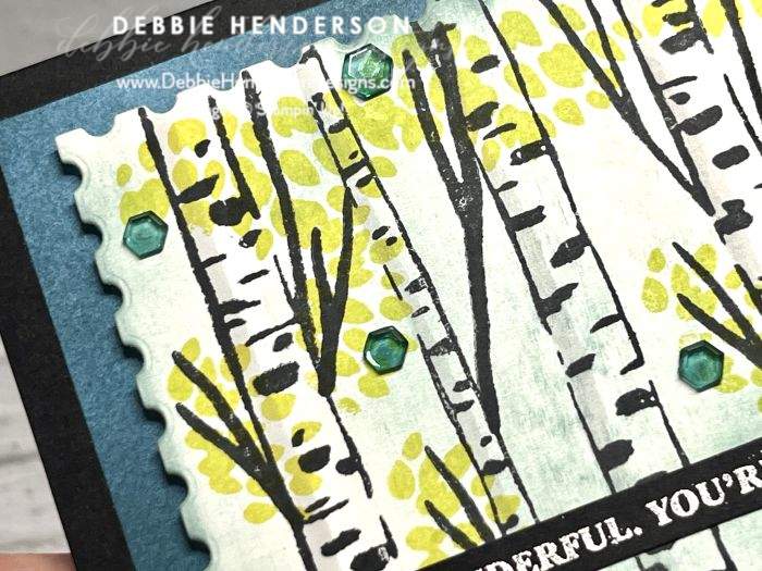 I love the pretty birch tree images from the Aspen Grove stamp set. All of the trees are individual stamps that you space as you like. You can use one, two, three or more trees like I did today: