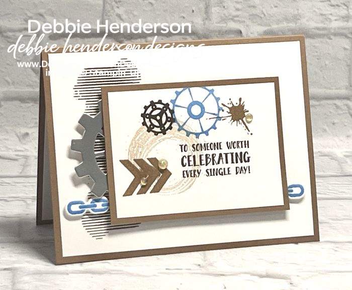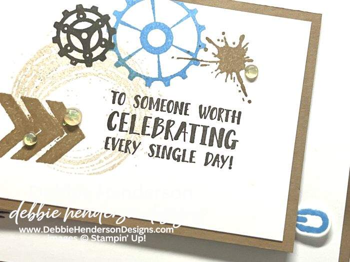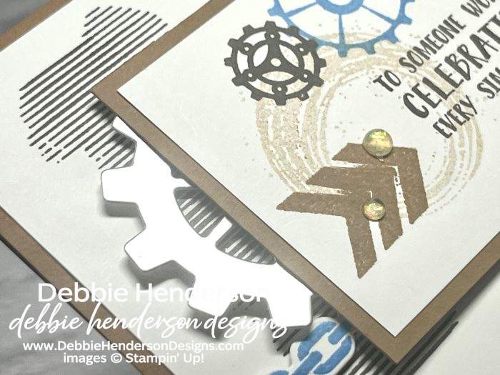 - Layer 5: Basic White Cardstock 3-1/2 x 2-1/2. Stamp the sentiment with Early Espresso Ink 1″ from the right side. Add more stamping with the gears, arrows and splatter with Early Espresso, Azure Afternoon and Pecan Pie Inks. Glue to soft suede layer flat.