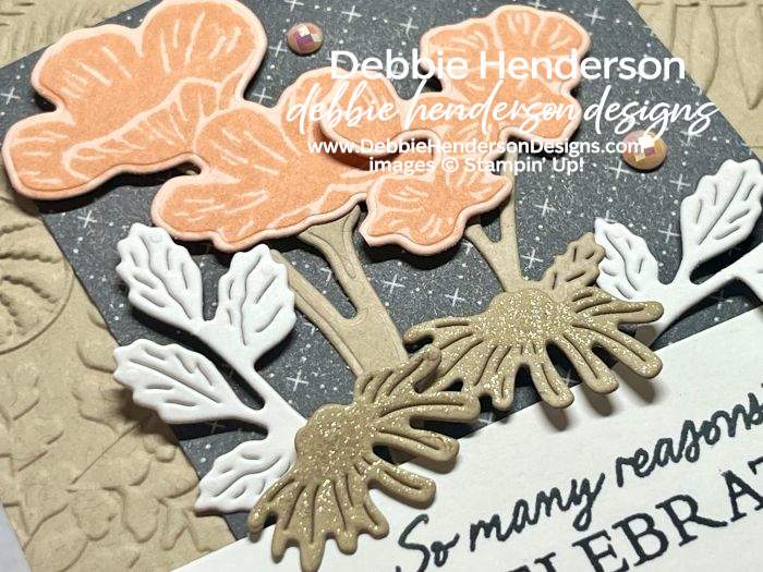 • Tools & Accessories: Flowering Meadows Dies, Ferns & Flora 3D Embossing Folder, Pearlized Faceted Circles, Mini Stampin’ Dimensionals, Wink Of Stella Clear Glitter Brush