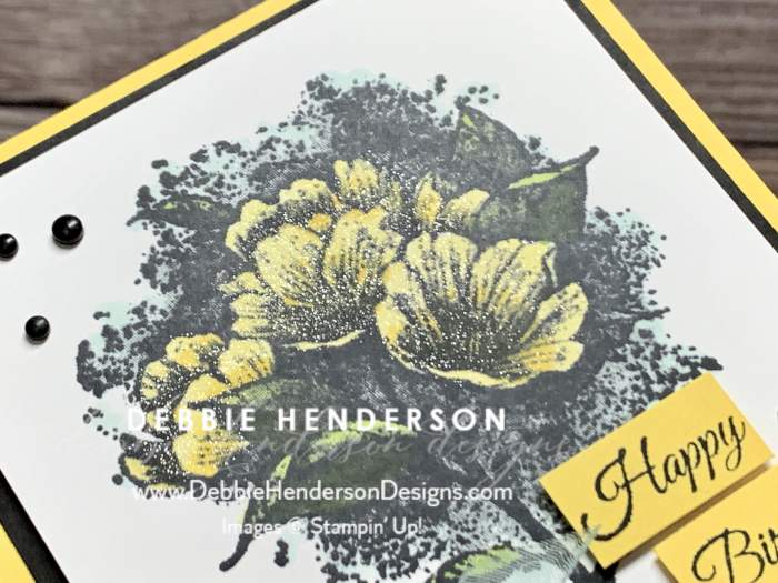 Look how pretty the flower image is stamped in black and colored in daffodil. I used Stampin’ Blends Markers to color. I also added a small layer of the new Sunshine & Rainbows Designer Paper that you can earn for free as well during Sale-A-Bration.
