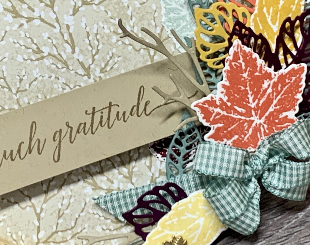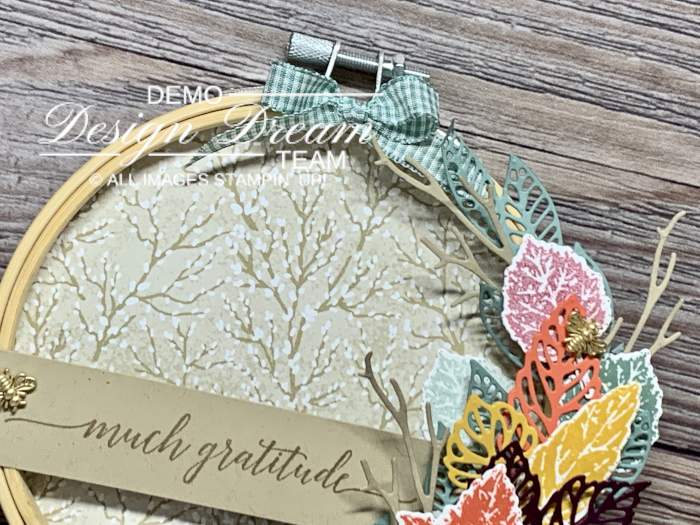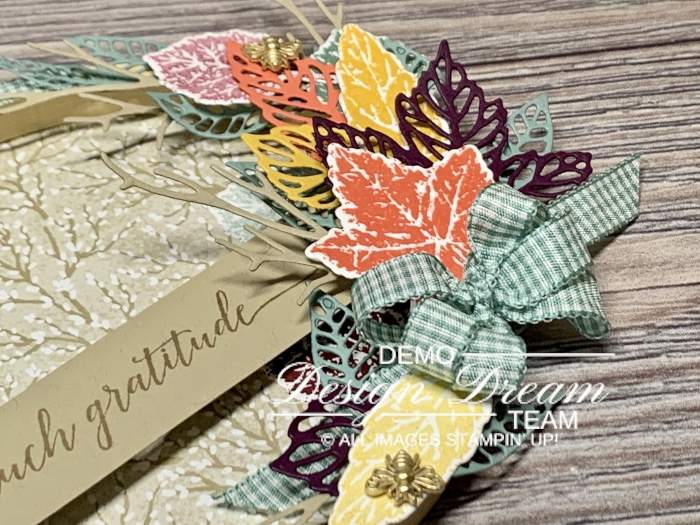 I used so many leaves…stamped leaves and diecut leaves. And I added in some of our Harvest Meadow Designer Paper as my backdrop. You can see some of the details with these photos: