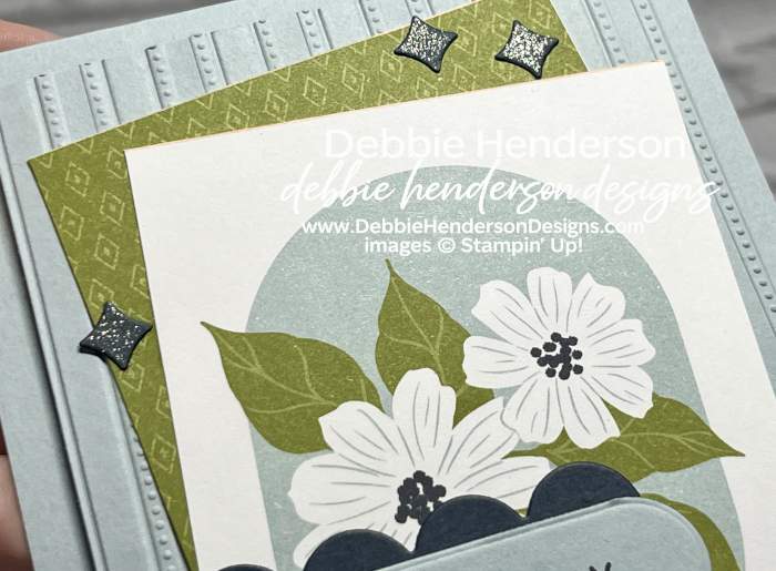I’m back today, with a project I created for Deloris and I when we met for stamping a few weeks ago. This time I used a preprinted layer from the Lovely Blossoms Designer Paper. It was fun to use this layer and add lots of other layers too!