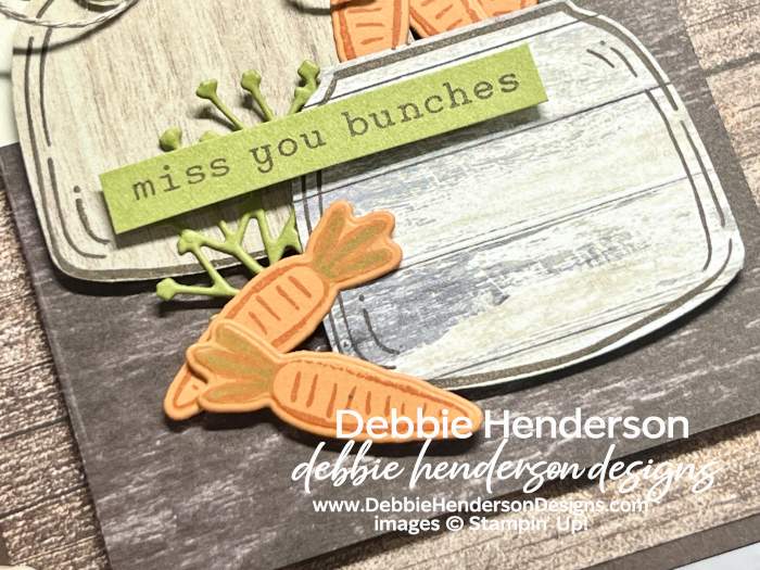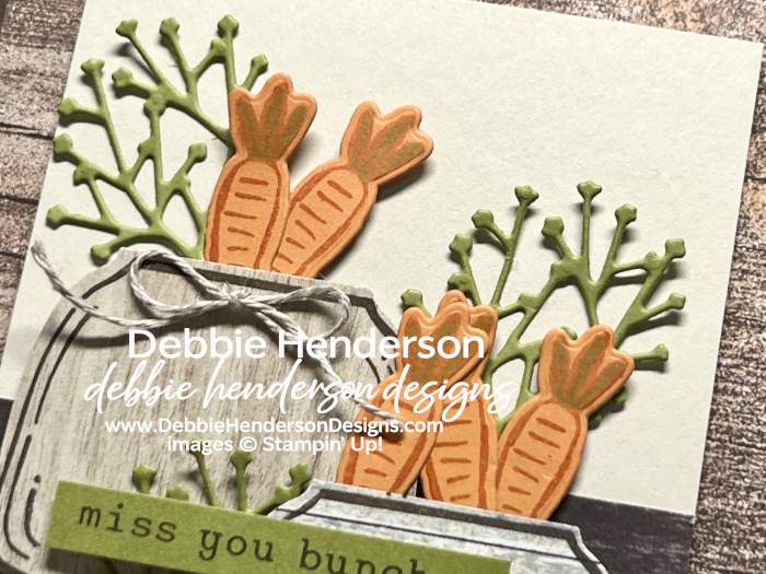 • Carrots: Stamp 7 carrots on Pumpkin Pie Cardstock with Pumpkin Pie Ink. Cut with the die. Color the tops with Old Olive Light Stampin’ Blends. Tuck and glue 5 carrots inside the 2 jars with Mini Stampin’ Dimensionals. Glue 2 carrots to the left of the bottom jar with Mini Stampin’ Dimensionals.