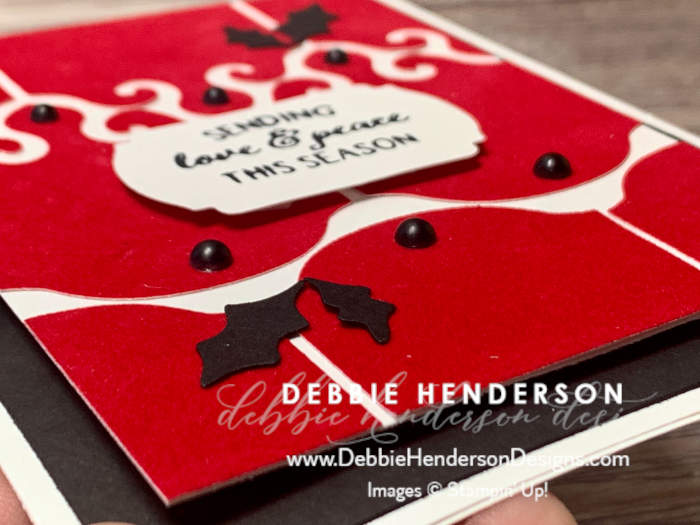 - Holly Leaves: Using Basic Black Cardstock and the Holly Border Punch, cut 2 sets of the holly leaves. Glue to card front using liquid glue.