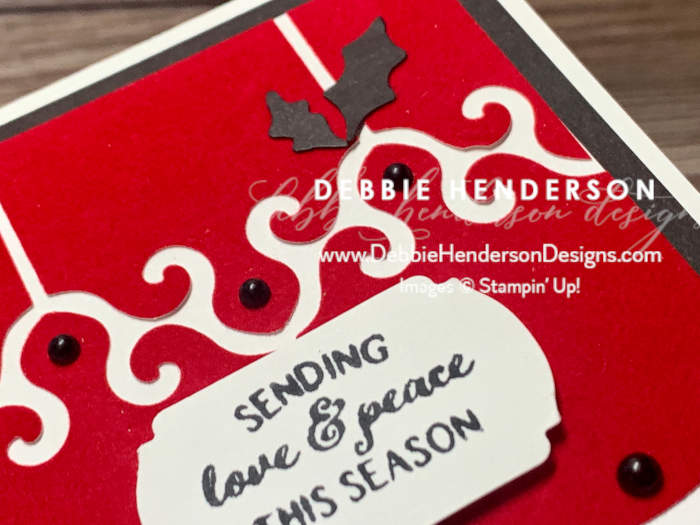 - Holly Leaves: Using Basic Black Cardstock and the Holly Border Punch, cut 2 sets of the holly leaves. Glue to card front using liquid glue.