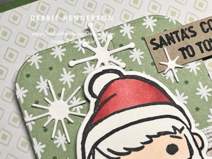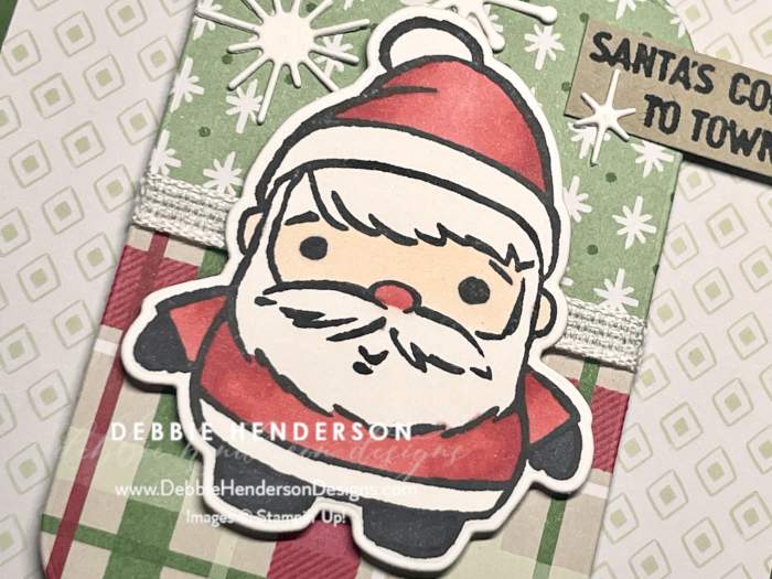 - Santa: Stamp the Santa image on Basic White Cardstock with Memento Black Ink. Color with Stampin’ Blends. Cut with the die. Glue Santa to tag with Stampin’ Dimensionals. Glue tag to card front with Stampin’ Dimensionals.