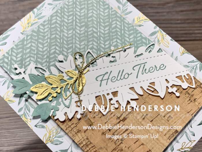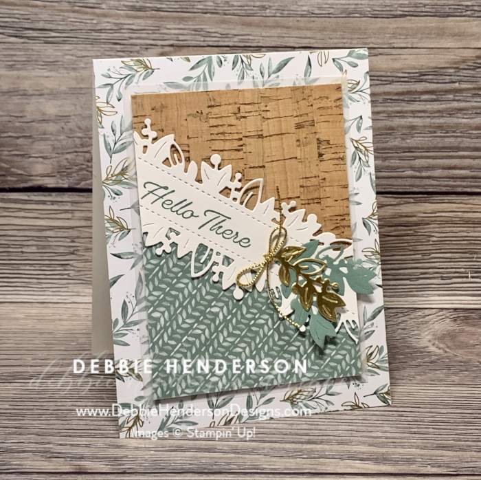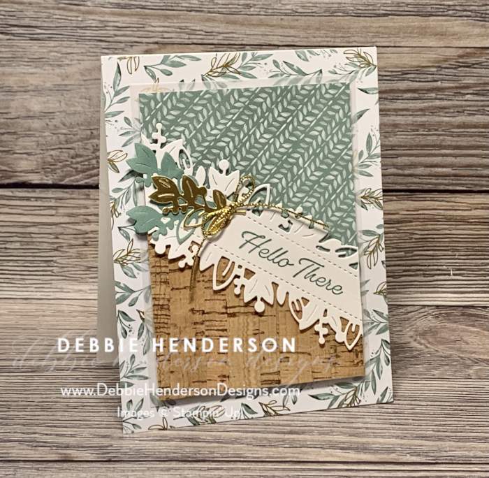 I have two beauties today that I showed on a Facebook Live video last night. What was neat is how I cut a layer of the Ever Eden Designer Paper and the Cork Specialty Paper the same size, and then cut diagonally to make four pieces I could interchange. You’ll see in my video how I didn’t even have to measure to make my cut.
