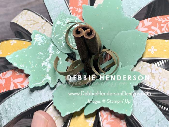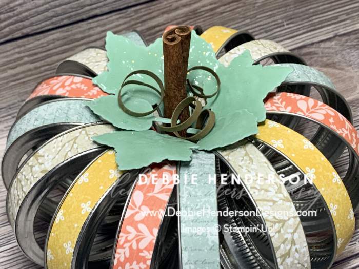 The tendrils at the top are created with snippets of Soft Suede Cardstock wrapped around the handle of a paint brush. By wrapping and pressing in place, they keep the curls that you see. The center of my pumpkin is a cinnamon stick. I used the regular canning lids and not the wide mouth.