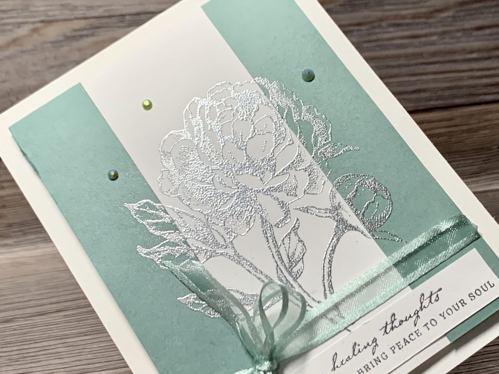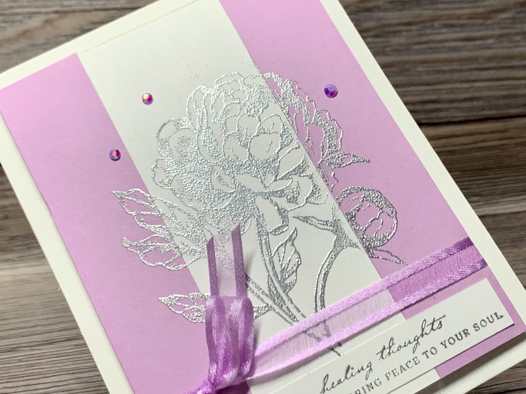 I show you how to glue three panels side-by-side and stamp the image with VersaMark Ink and sprinkle Silver Embossing Powder. Such a quick and easy technique. I even added some gems to coordinate too!