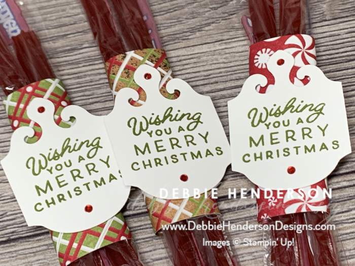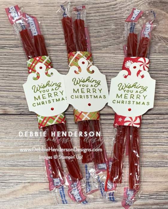 This month I used two twizzlers side-by-side and wrapped them with a 3″ x 3″ piece of the Gingerbread & Peppermint Designer Paper. It was so easy to mass-produce these treats.