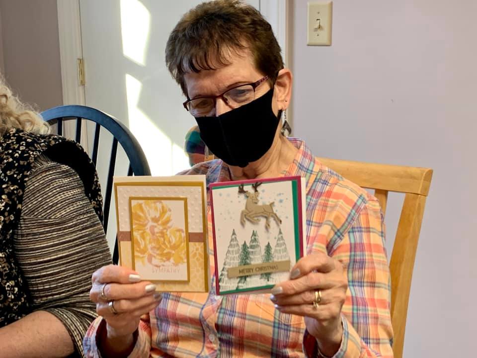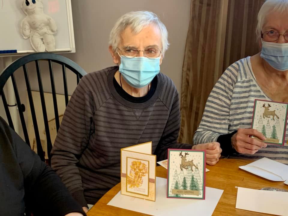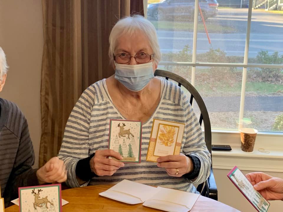 I love going to the Putnam House Senior Center once a month. The ladies are so fun to make cards with. We always make two cards and for the past few months, I have been including one Christmas card so they will have a few to send out to their family and friends. Here they are with their finished projects:
