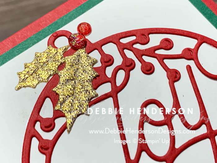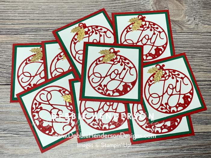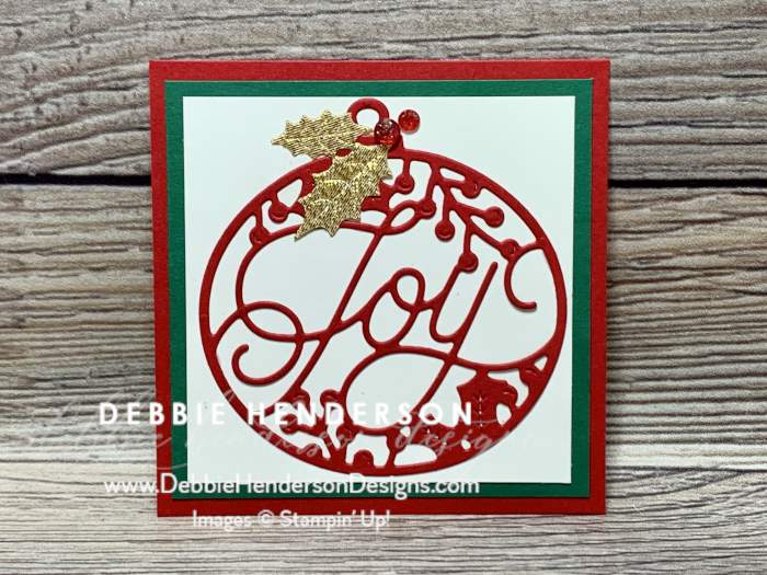 The squares below are the ones I created and mailed out to 8 people from my group. I think we ended up with 12 groups of 9 people. I used the Delicate Baubles Dies and added the Gold Holly Leaves at the top. I completed my squares with with some Wonderful Gems (the red ones).
