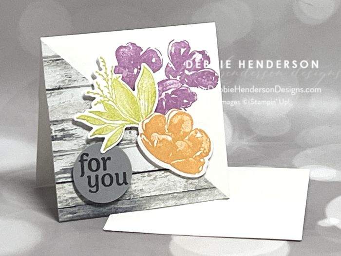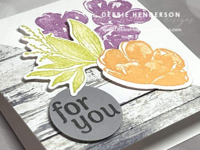 I used some of our Country Woods Designer Paper 3 x 3 and cut diagonally to glue to the left side. My card base measures 6 x 3 and scored at 3″. All of the images are from Regal Flora Bundle in Peach Pie, Lemon Lime Twist and Fresh Freesia.