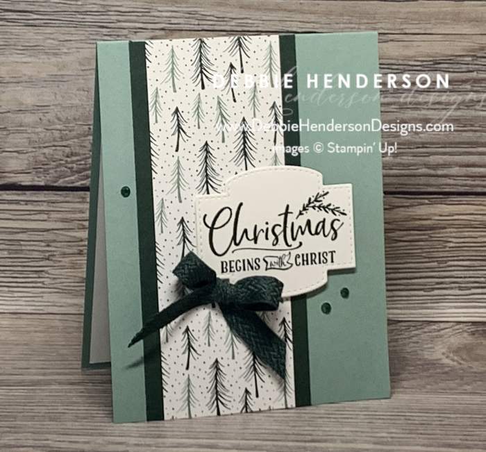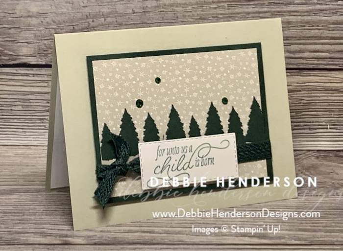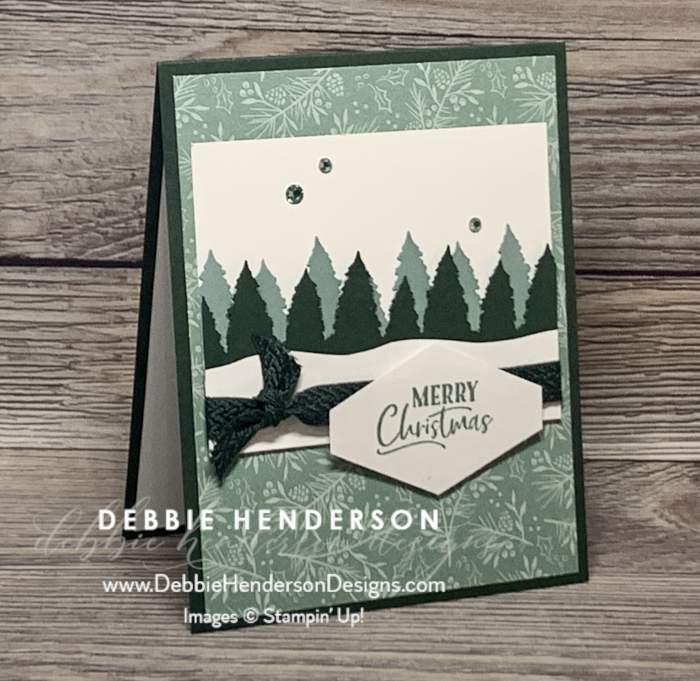 Once a month, I host a Team meeting on Zoom and I always start out with some stamping. I try to incorporate a set of at least four cards that can be used for a class or workshop idea for my team members. You can see that I used the Tidings Of Christmas Designer Paper on three of the cards and I also used the Evergreen Border Punch on two of the cards. Here are some individual photos of each card: