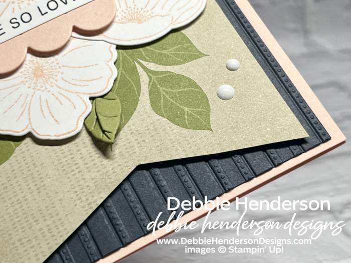 The tag layer on my card is actually another preprinted rectangle from the Lovely Blossoms Designer Paper. All we did to it after it was cut, was to trim the bottom with Paper Snips to resemble a banner shape. The leaves that you see in the background are part of the preprinted design: