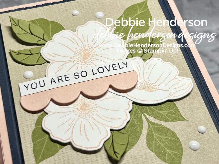 I love the look of the Petal Pink Ink on Basic White Cardstock for each flower. No coloring was needed on these flowers to keep the Clean & Simple look to them. Tomorrow, you’ll get to see the full circular diecut that I used under my sentiment today. This one was trimmmed to 1 row of 4 circles.