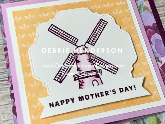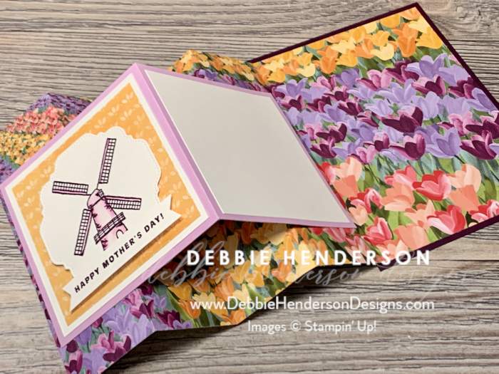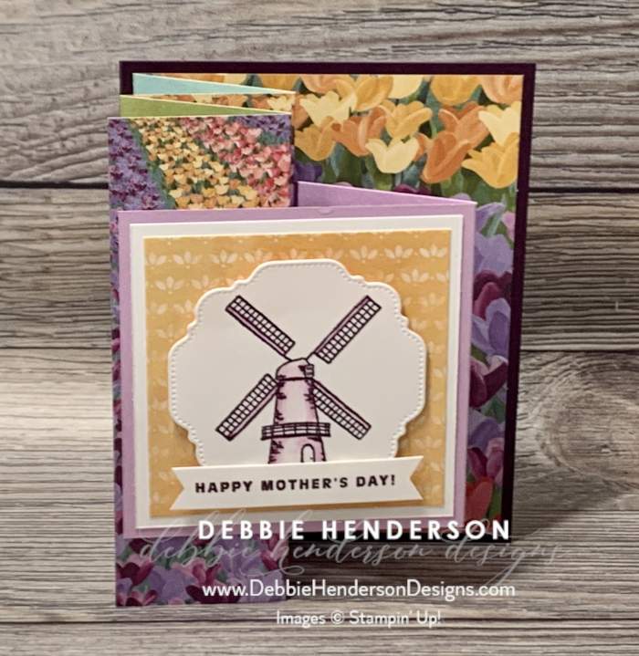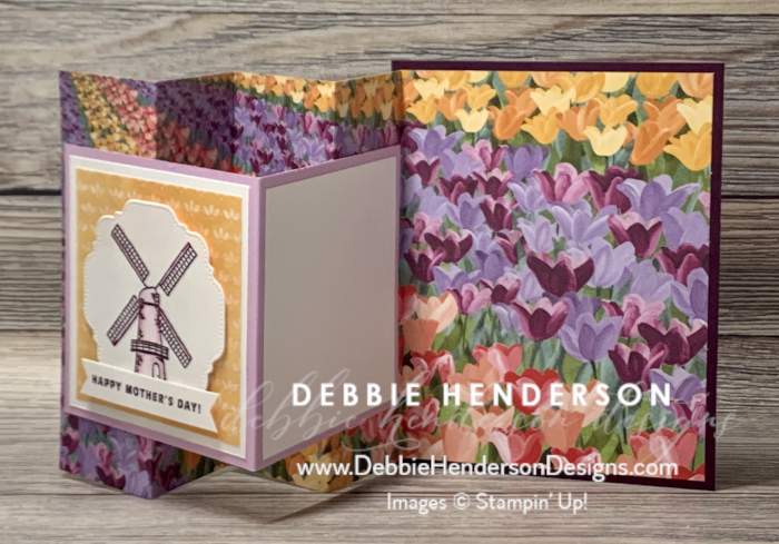 This Fancy Card Fold uses the Tulip Fields Bundle, Flowering Fields Designer Paper and Hippo & Friends Dies. You can see how the card folds flat and how the card opens. I also used a Blender Pen to color with the inked lines on my windmill:
