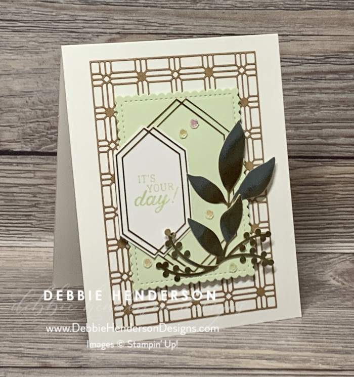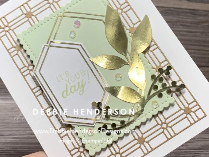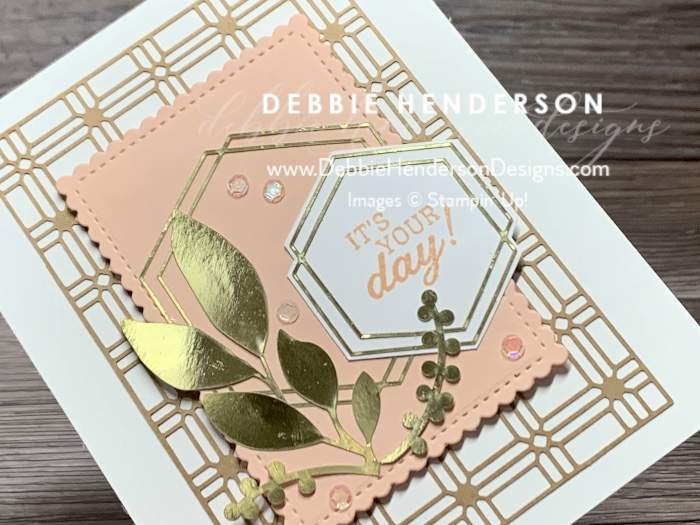 Welcome to our montly blog hop! I enjoy participating in these blog hops each month along with my fellow Stampin’ Up! demonstrators. This month I am featuring the Expressions In Ink Ephemera Pack (155465). The gold diecuts are so much fun to play with!