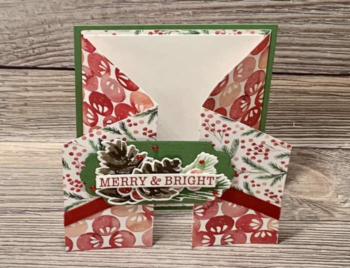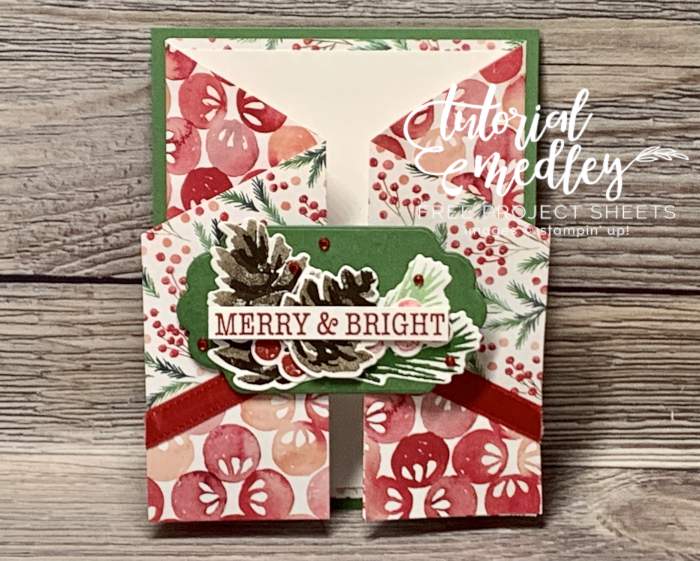 I love this fancy card fold I created for our November Tutorial Medley Group. The Painted Christmas Designer Paper looks so pretty paired with the Christmas Season Bundle. The photos below show you how the card is scored and folded: